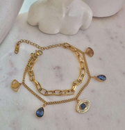 A fusion of elegance and protection, this real gold-plated bracelet features a layered chain design with blue teardrop charms and...